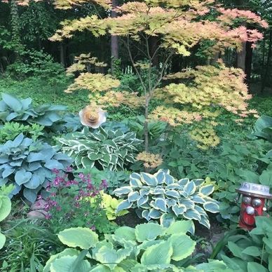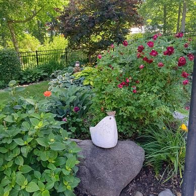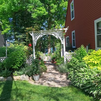 This beautiful 40 year old Colonial home on Lake Iroquois is the setting for the “Playing with Greens”cottagey garden. The owner, who started gardening at the age of 13, likes the calm feel of the unique plantings around her home. Roses climb over the top of her entrance door. The front of the house includes an island bed, and red coleus, huge (1’ flowers) Hydrangeas, hyacinth bean climber, perennial geranium, and more. A lovely arch with honeysuckle and clematis lead the way to the lakeside. Thalictrum, butterfly bush, bee balm all grace the steep path down to the lake. Facing the lake are more gardens including a butterfly garden with grasses, Queen Ann lace, milkweed, joe pye weed, etc.