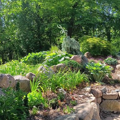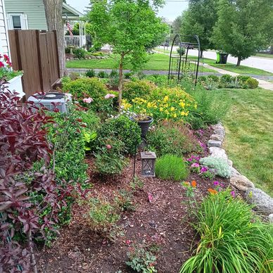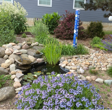 In the five years that the homeowners have lived in this 35 year-old home, they have brought a variety of plantings and hardscaping to their property in this “With a Little Help from my Friends”garden which demonstrates what can be achieved by using plantings that have been donated and sought out through the years. Particularly noteworthy is the attractive blue garden shed which is reached by a rock walkway. Multiple mini-gardens occupy the yard, each with their own character. One features a small waterfall/pond with waterlilies; another, an enclosed vegetable garden; yet another cleome flowers and bushes. Great Lakes rocks are evident throughout the gardens. Cute seating and yard art dots the area with light features that make this yard even more inviting after dark.