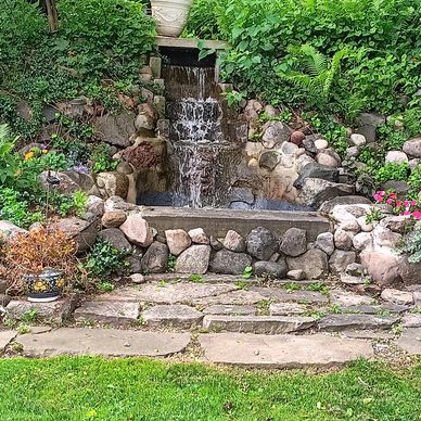 Inspired by visits to Europe, this homeowner has created a “European Eclectic” garden in the heart of Fenton. The concrete pond is home to almost a dozen very large goldfish surrounded by waterlilies. The waterfall in the corner (laboriously updated within the past couple of years) features a reproduction of the Scottish “Face in the Vines” mask. Extending beyond the landscaped hill from the main yard is the “South Lawn” including a secluded “secret garden”. Plantings throughout the property include redbud and rose-of-Sharon trees, coleus, lobelia, coneflower, Shasta daisies and more.